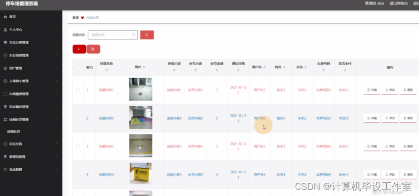 违规处罚管理,在违规处罚管理页面可以查看标题名称、图片、违规内容、处罚内容、处罚金额、通知日期、用户名等内容,并可根据需要对违规处罚管理进行添加,修改,删除或详细内容等操作,如图5-6所示。