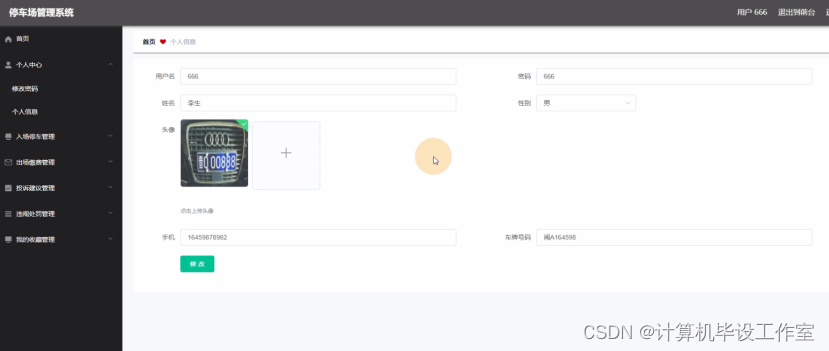 个人信息,在个人信息页面可以编辑用户名、密码、姓名、性别、头像、手机、车牌号码等内容,并可根据需要对个人信息详细添加、修改、删除操作,如图5-16所示。