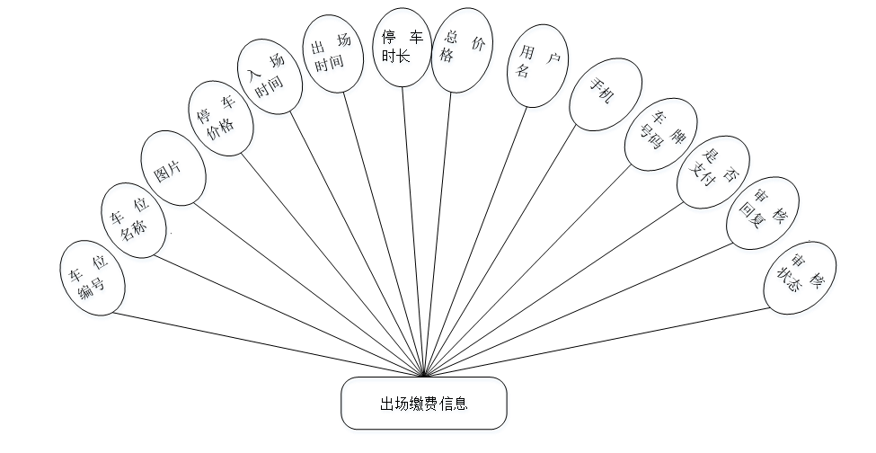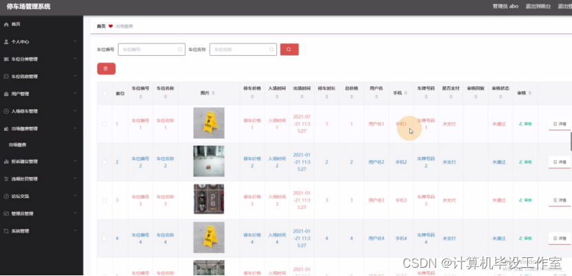 出场缴费管理,在出场缴费管理页面可以查看车位编号、车位名称、图片、停车价格、入场时间、出场时间、停车时长、总价格、用户名、手机、车牌号码、是否支付、审核回复、审核状态等内容,并可根据需要对出场缴费管理进行添加,修改,删除或详细内容等操作,如图5-5所示。