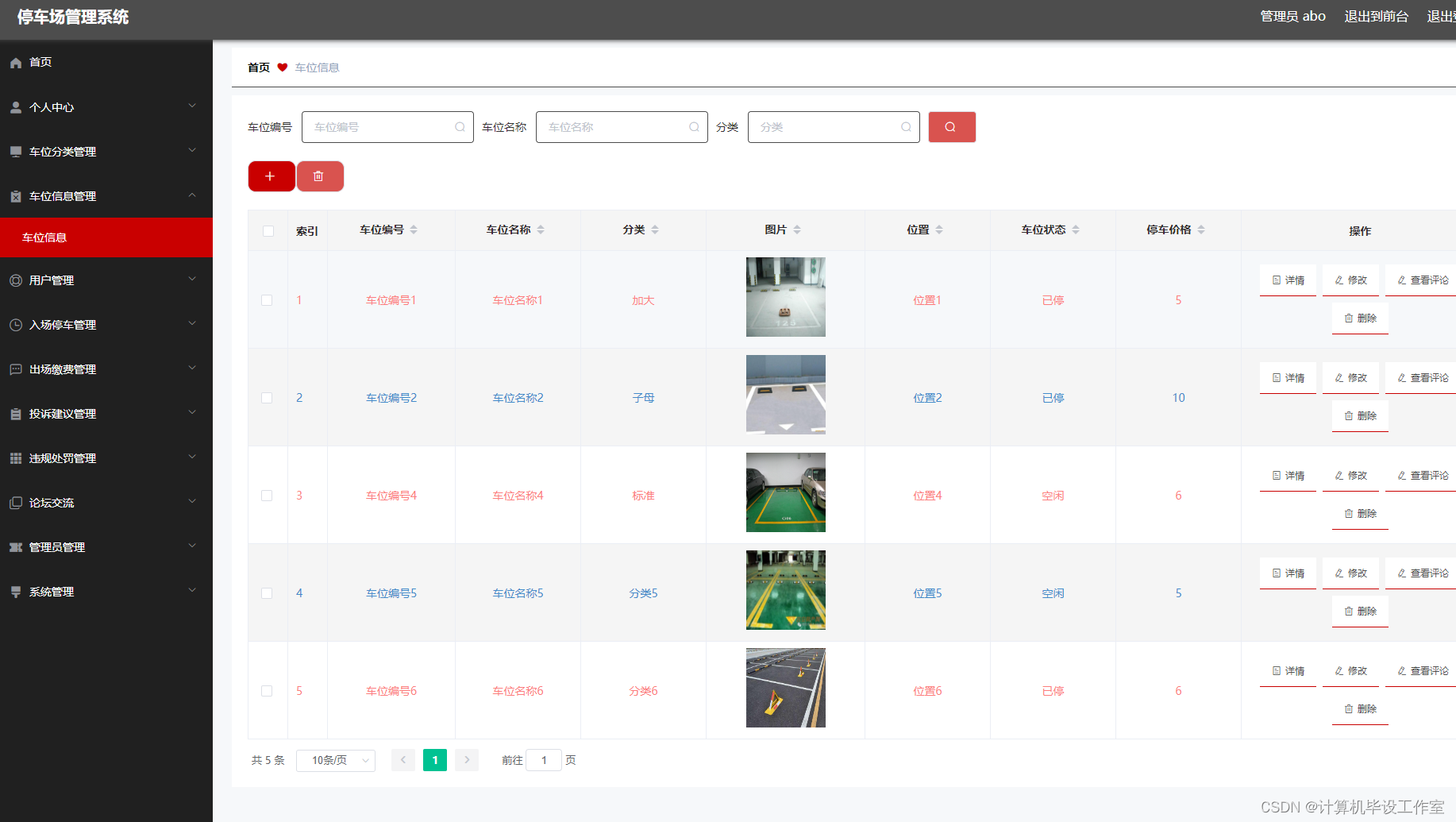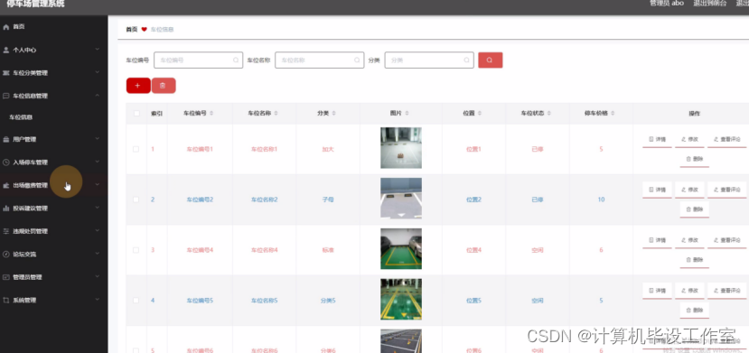 前台车位信息,通过内容列表可以获取车位编号、车位名称、分类、图片、位置、车位状态、停车价格、车位详情查看等操作,如图5-10所示。