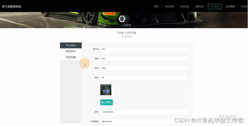 个人中心,通过内容列表可以获取用户名、密码、姓名、性别、头像、手机、车牌号码等信息可进行增、删、改或查看我的发布、我的收藏等操作,如图5-12所示。