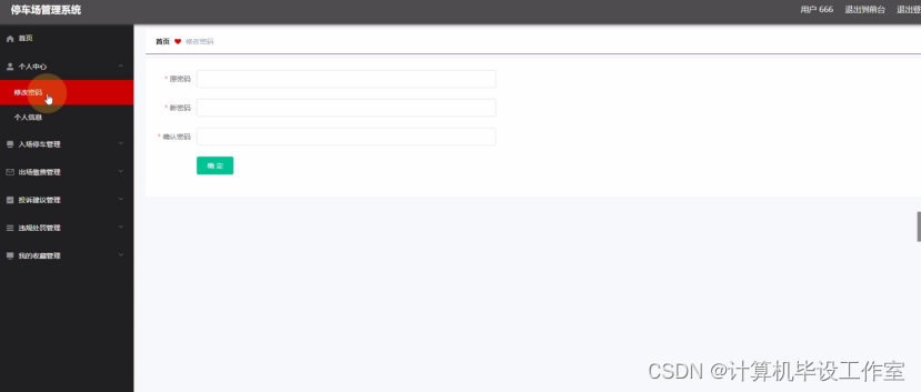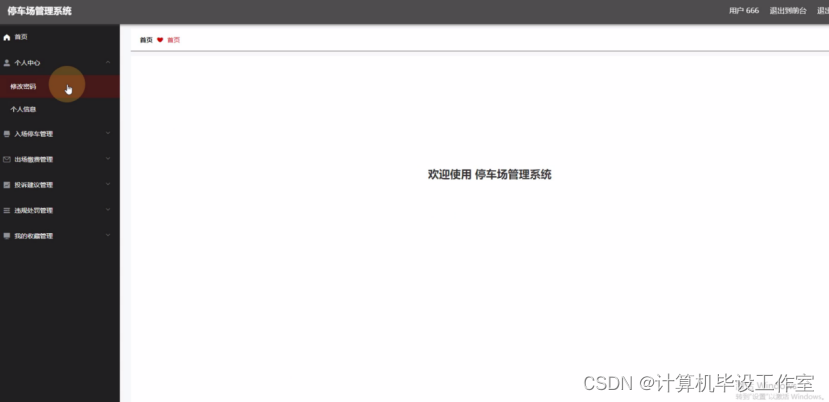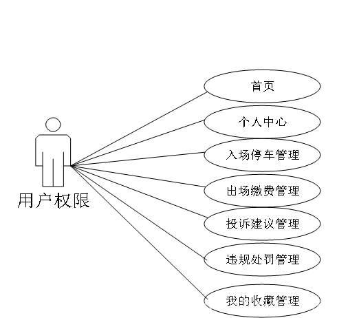 用户权限;首页、个人中心、入场停车管理、出场缴费管理、投诉建议管理、违规处罚管理、我的收藏管理。