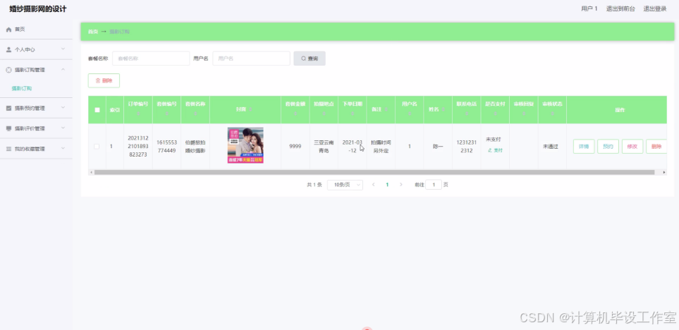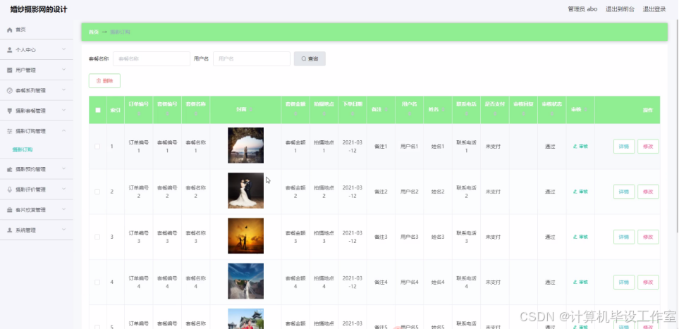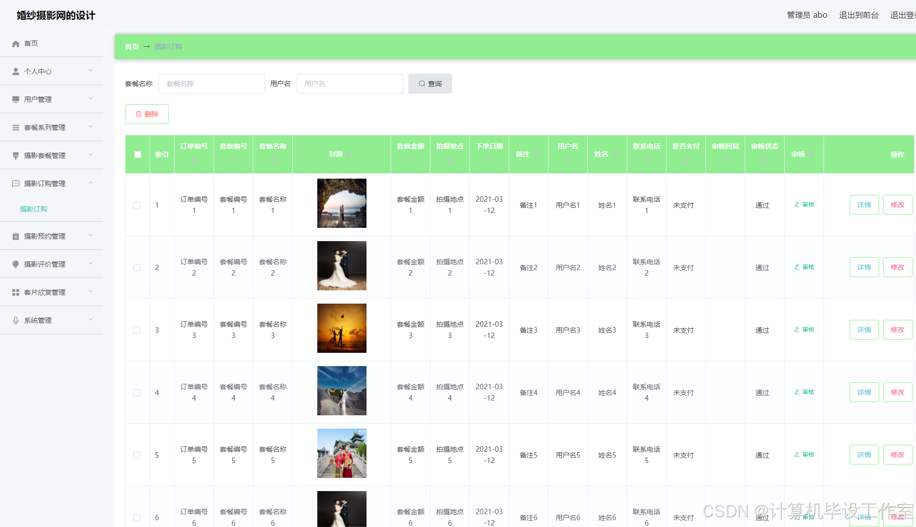 管理员对摄影订购管理页面进行填写订单编号、套餐编号、套餐名称、封面、套餐金额、拍摄地点、下单日期、备注、用户名、姓名、联系电话、是否支付、审核回复、审核状态、审核等信息进行详情、删除、修改等操作。效果图如图5-5所示。