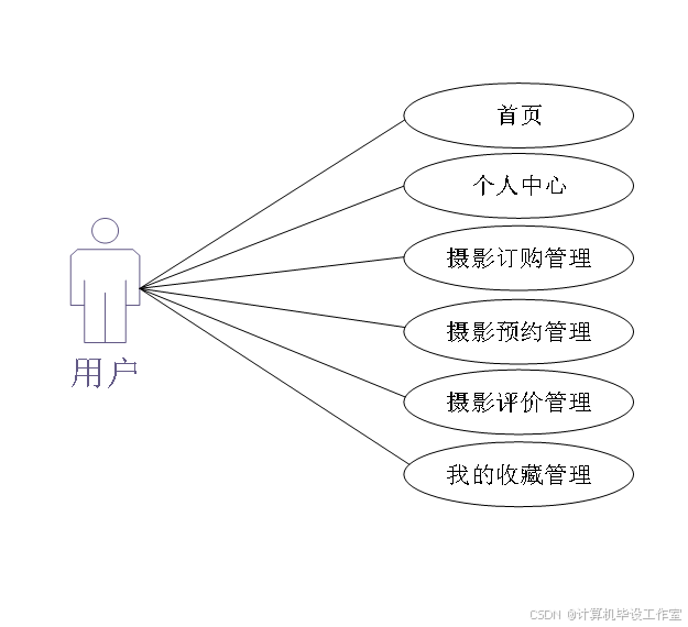 前台用户可以进行注册登录、查看摄影套餐、订购下单、摄影预约、摄影评价、客片欣赏、摄影资讯、个人中心、在线客服等功能