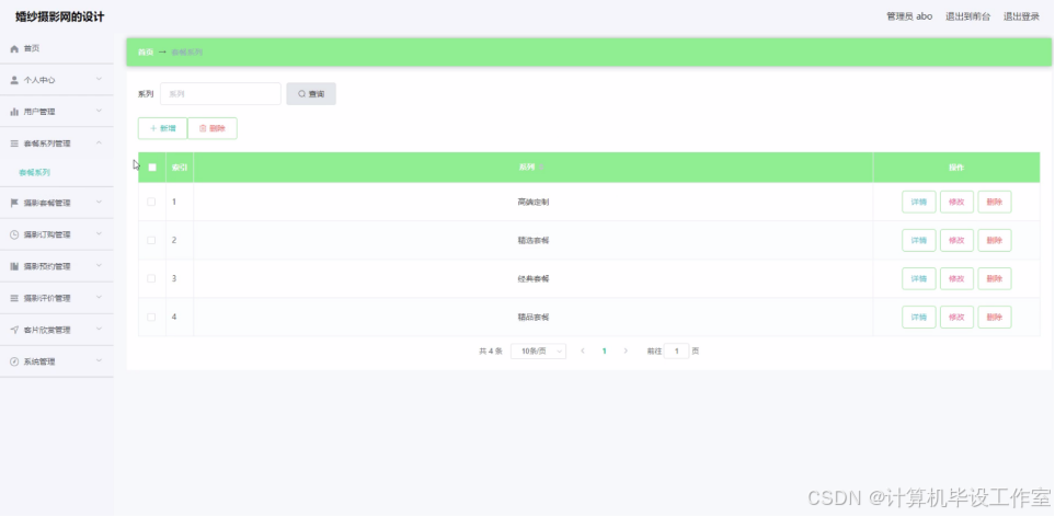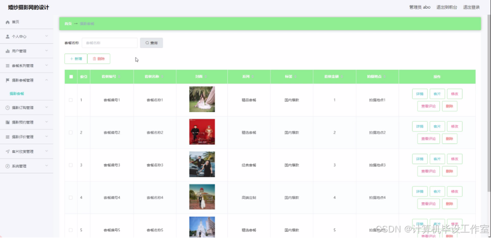 本课题要求实现一套婚纱摄影网的设计的开发与实现,主要实现功能包括管理员:首页、个人中心、用户管理、套餐系列管理、摄影套餐管理、摄影订购管理、摄影预约管理、摄影评价管理、客片欣赏管理、系统管理,前台首页:首页、摄影套餐、客片欣赏、摄影资讯、个人中心、后台管理、在线客服,用户:首页、个人中心、摄影订购管理、摄影预约管理、摄影评价管理、我的收藏管理。