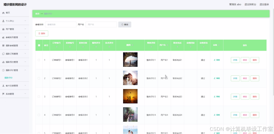管理员对摄影评价管理页面填写编辑订单编号、套餐编号、套餐名称、服务评分、技术评分、晒图、整体评价、用户名、联系电话、审核回复、审核状态、审核等信息进行详情、删除、修改等操作。效果图如图5-7所示。