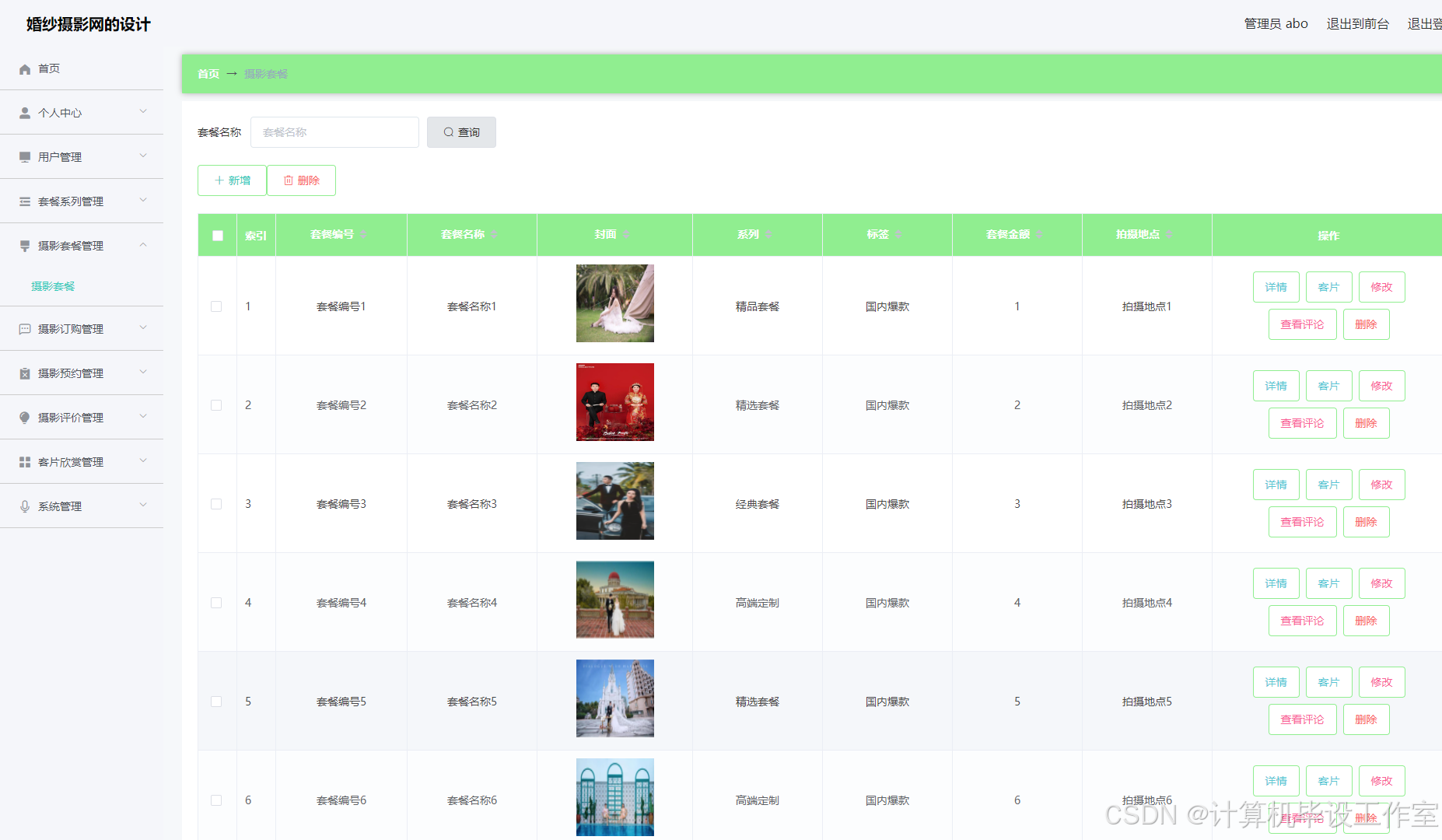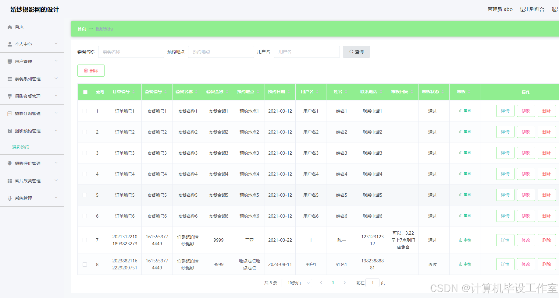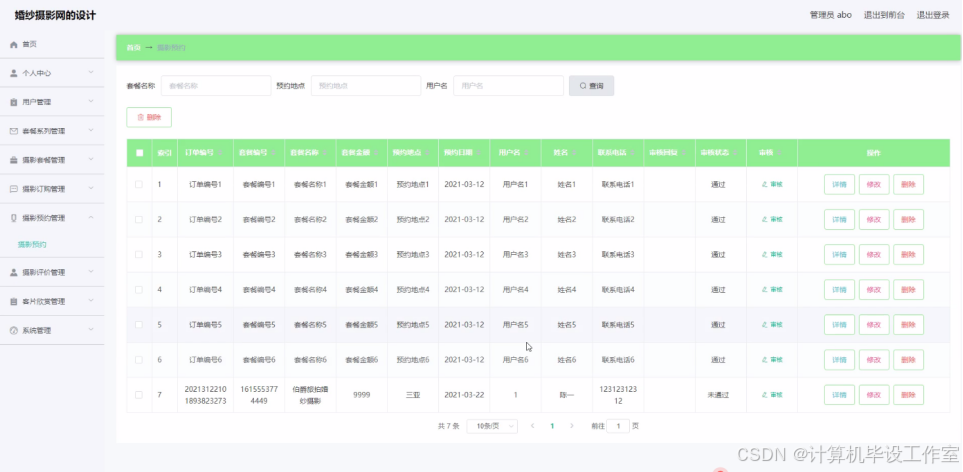用户进入摄影订购管理页面可以填写订单编号、套餐编号、套餐名称、封面、套餐金额、拍摄地点、下单日期、备注、用户名、姓名、联系电话、是否支付、审核回复、审核状态等信息进行详情、预约、修改、删除等操作。效果图如图5-14所示。