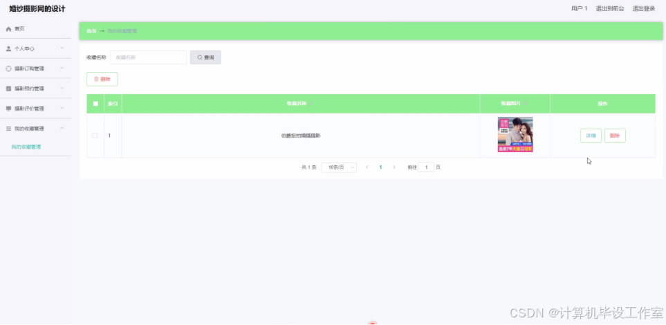 用户对我的收藏管理页面进行填写收藏名称、收藏图片等信息进行详情、删除等操作。效果图如图5-17所示。