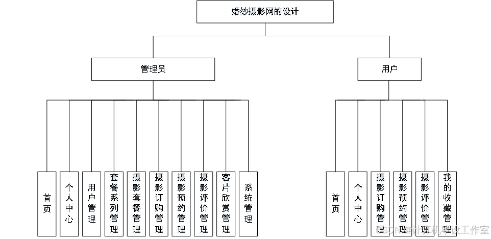 通过系统需求分析,本婚纱摄影网的设计主要实现功能包括;管理员:首页、个人中心、用户管理、套餐系列管理、摄影套餐管理、摄影订购管理、摄影预约管理、摄影评价管理、客片欣赏管理、系统管理,前台首页:首页、摄影套餐、客片欣赏、摄影资讯、个人中心、后台管理、在线客服,用户:首页、个人中心、摄影订购管理、摄影预约管理、摄影评价管理、我的收藏管理等功能。其功能结构图如下图4-1所示: