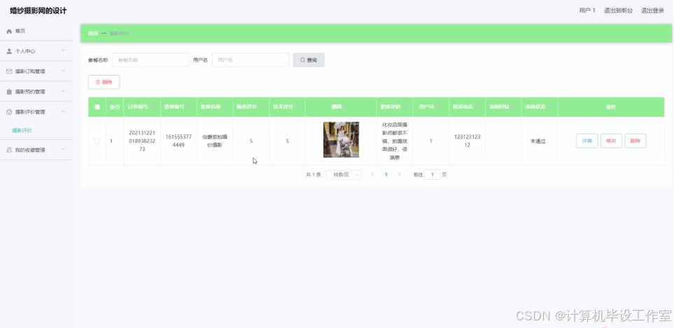 用户对摄影评价管理页面进行填写订单编号、套餐编号、套餐名称、服务评分、技术评分、晒图、整体评价、用户名、联系电话、审核回复、审核状态等信息进行详情、修改、删除。效果图如图5-16所示。