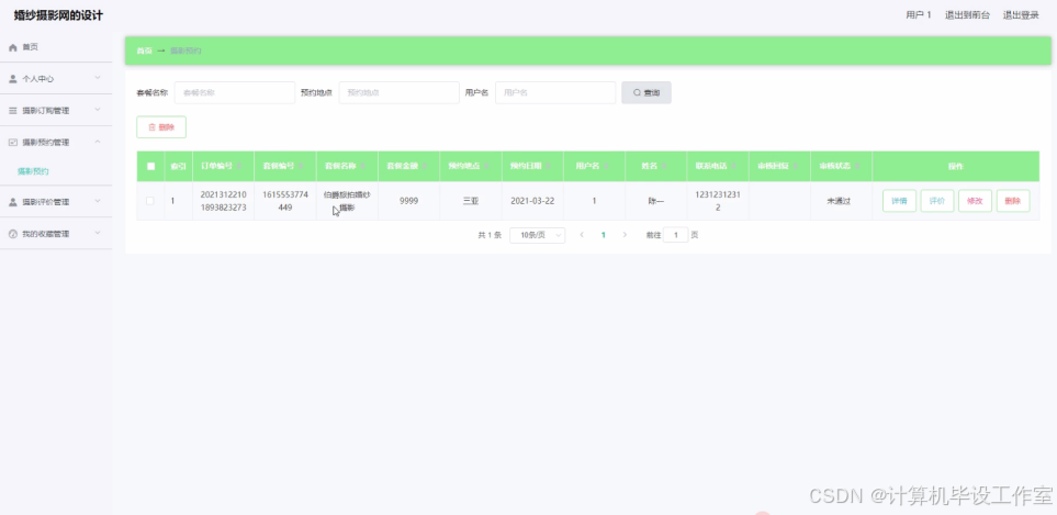 用户对摄影预约管理页面可以填写订单编号、套餐编号、套餐名称、套餐金额、预约地点、预约日期、用户名、姓名、联系电话、审核回复、审核状态、审核等信息进行详情、评价、修改、删除等操作。效果图如图5-15所示。
