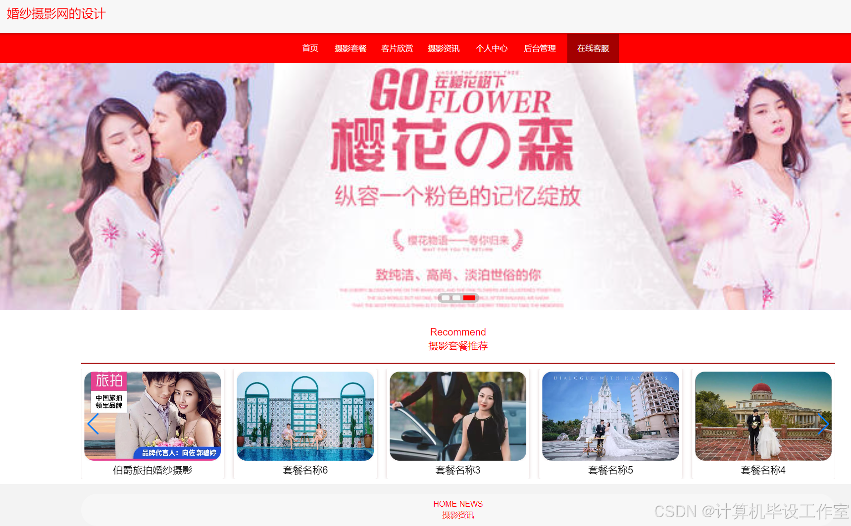 婚纱摄影网的设计,在前台首页可以查看首页、摄影套餐、客片欣赏、摄影资讯、个人中心、后台管理、在线客服等内容,如图5-10所示。