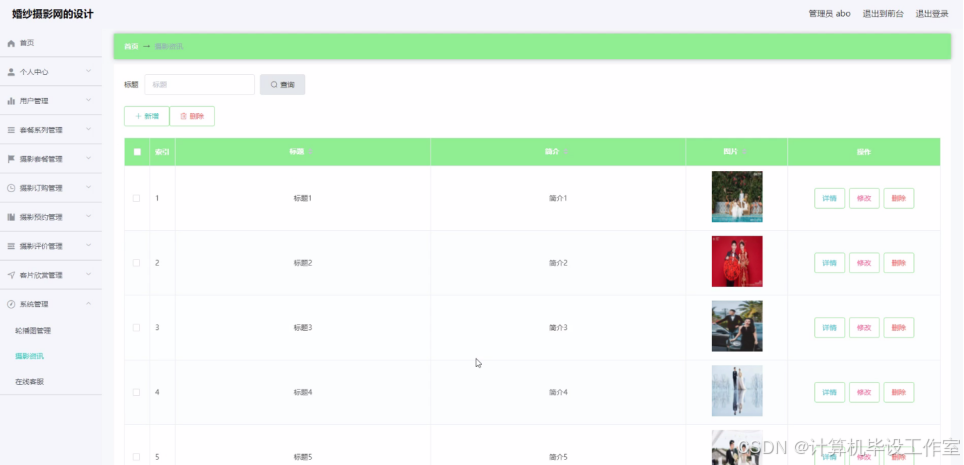 管理员对摄影资讯页面填写编辑标题、简介、图片等信息进行详情、删除、修改等操作。效果图如图5-9所示。