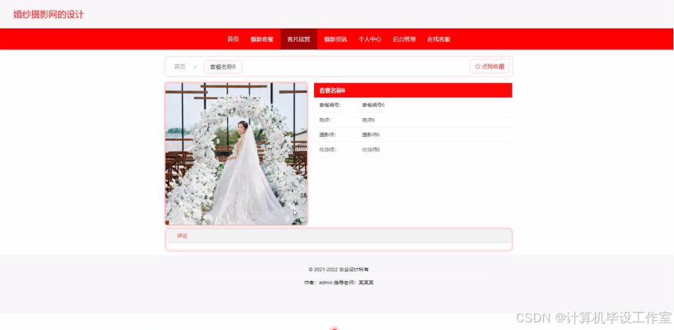 客片欣赏,在客片欣赏页面进行套餐编号、地点、摄影师、化妆师等内容进行查看或点我收藏操作,如图5-13所示。