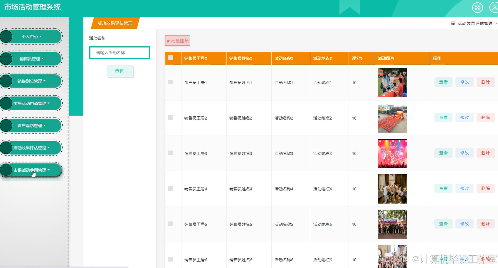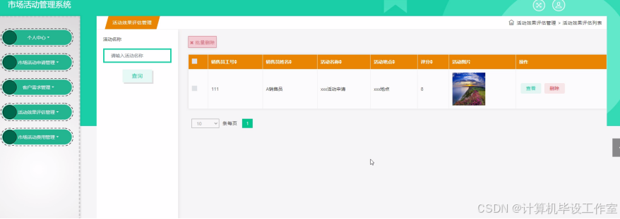 销售员点击活动效果评估管理,在活动效果评估管理页面,对售员工号、销售员姓名、活动名称、活动地点、评分、活动图片等内容,进行查询或者批量删除活动效果评估等操作,如图5-5所示。