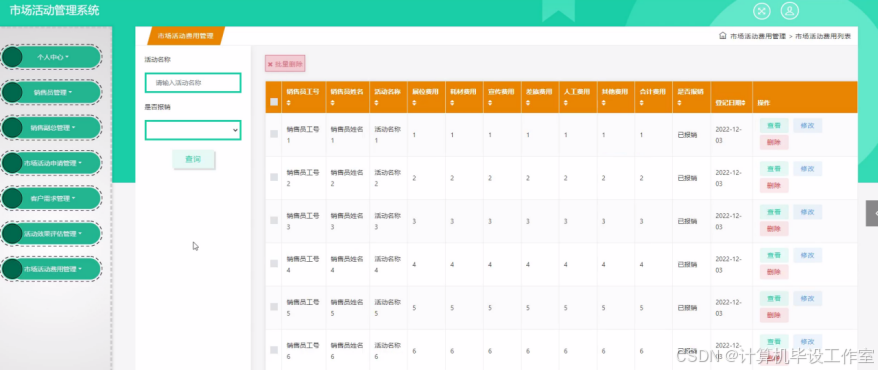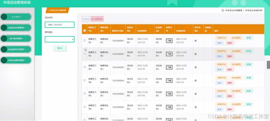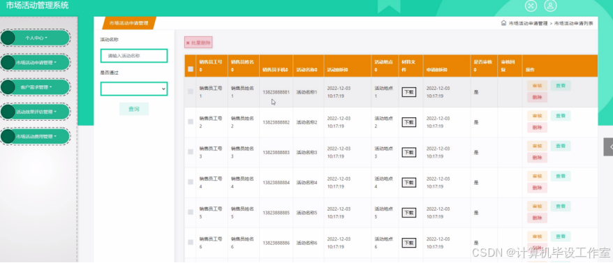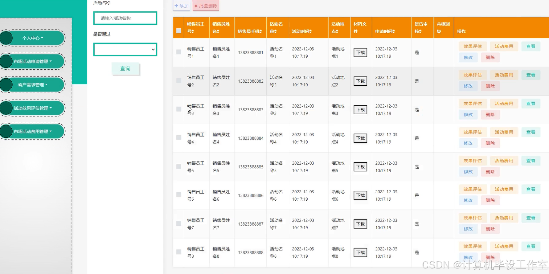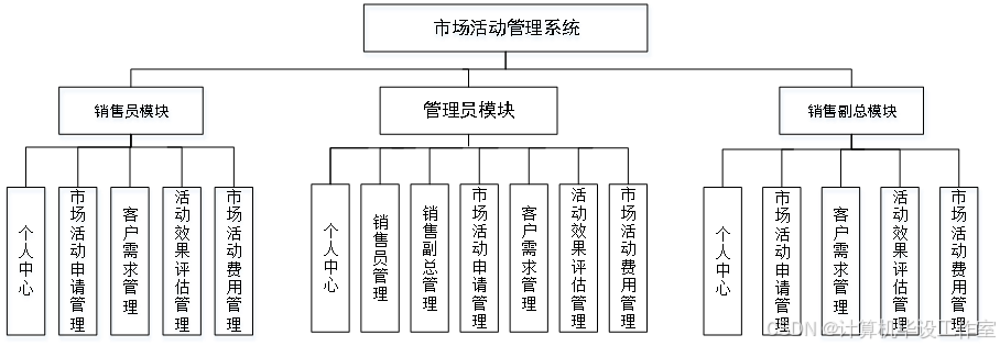 本课题要求实现一套市场活动管理系统,系统主要包括管理员模块和销售员、销售副总模块功能模块。
