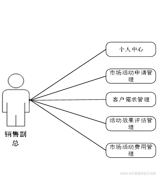 (4)销售副总,销售副总权限内功能包括;个人中心、市场活动申请管理、客户需求管理、活动效果评估管理、市场活动费用管理。