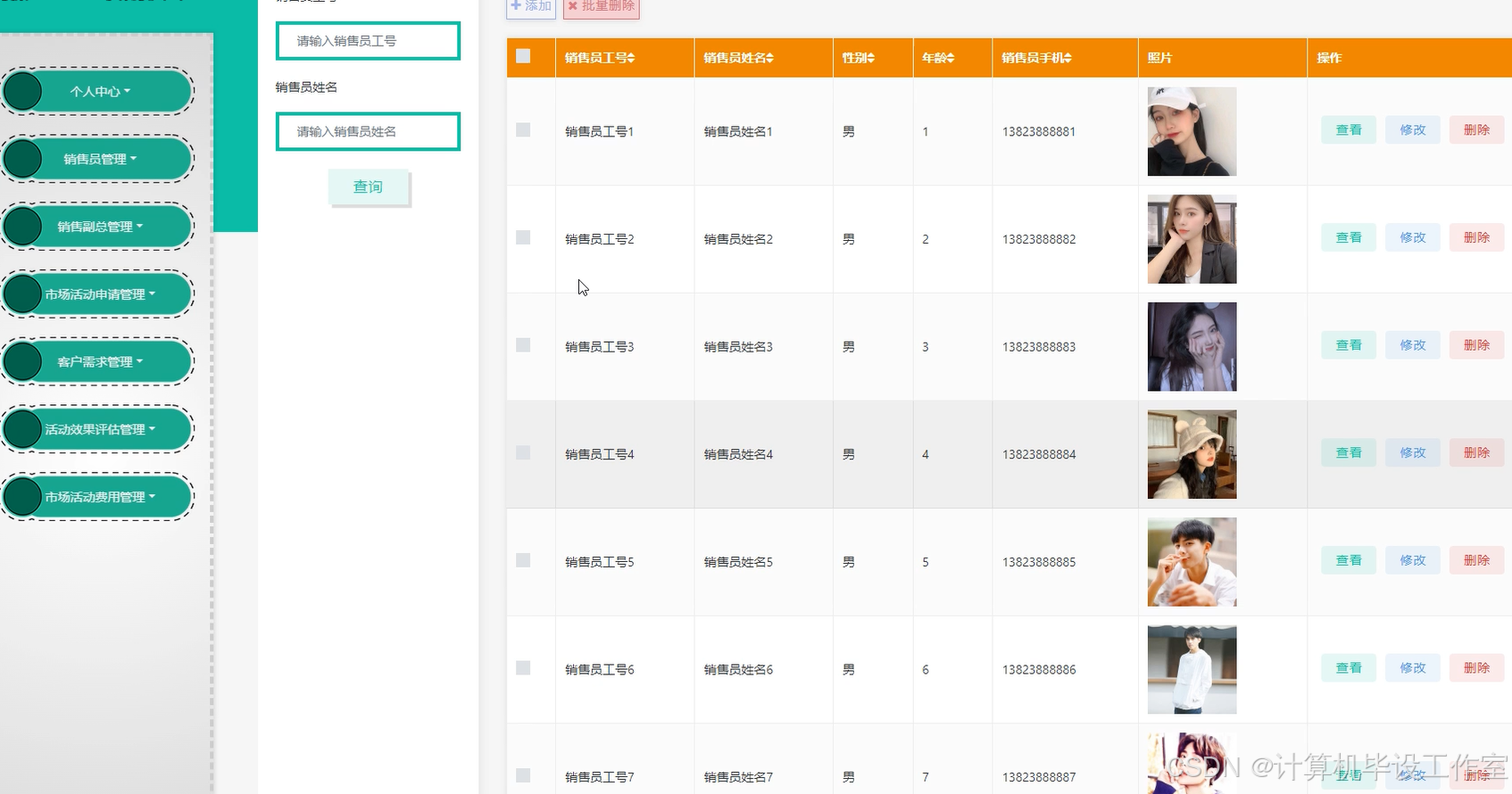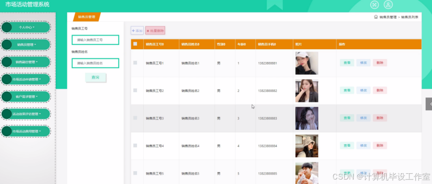 管理员点击销售员管理,在销售员管理页面,对销售员工号、销售员姓名、性别、年龄、销售员手机、照片等内容,进行查询或者添加、删除销售员信息等操作,如图5-13所示。