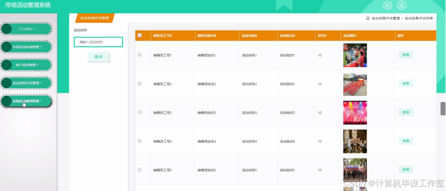 销售副总点击活动效果评估管理,在活动效果评估管理页面,对销售员工号、销售员姓名、活动名称、活动地点、评分、活动图片等内容,进行查询活动效果评估等操作,如图5-10所示。
