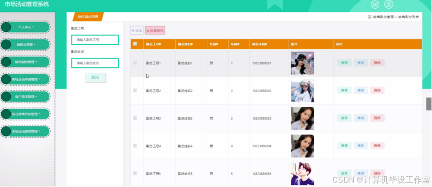 管理员点击销售副总管理,在销售副总管理页面,对副总工号、副总姓名、性别、年龄、副总手机、照片等内容,进行查询或者添加、删除销售副总信息等操作,如图5-14所示。