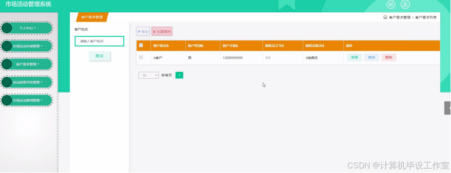 销售员点击客户需求管理,在客户需求管理页面,对客户姓名、客户性别、客户手机、销售员工号、销售员姓名等内容,进行查询或者添加、批量删除客户需求等操作,如图5-4所示。