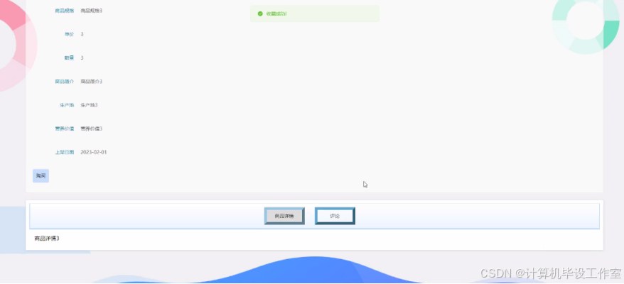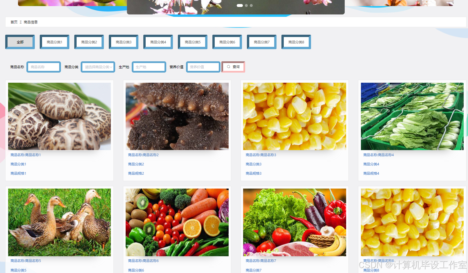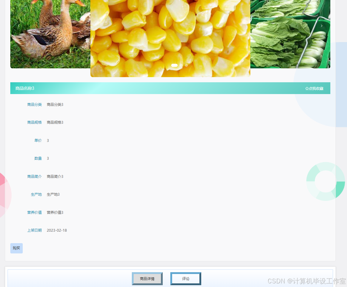居民点击商品信息,在商品信息页面的搜索栏输入商品名称、商品分类、生产地、营养价值,进行查询,还可以查看商品名称、商品分类、商品图片、商品规格、单价、数量、生产地、营养价值、上架日期等信息,进行点击购买或者收藏、评论等操作;如图5-3所示: