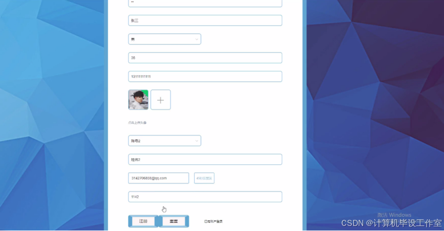在系统首页点击中间的注册/登录按钮,然后页面跳转到注册登录界面,后来输入信息完成后,单击注册或者登录操作,如图5-2所示: