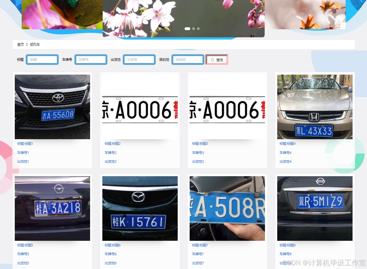 居民点击顺风车,在顺风车页面的搜索栏输入标题、车牌号、出发地、目的地,进行查询,然后可以查看标题、车牌号、车辆图片、出发地、目的地、账号、姓名、手机号码、发起时间,最后可以点击拼车等操作;如图5-4所示: