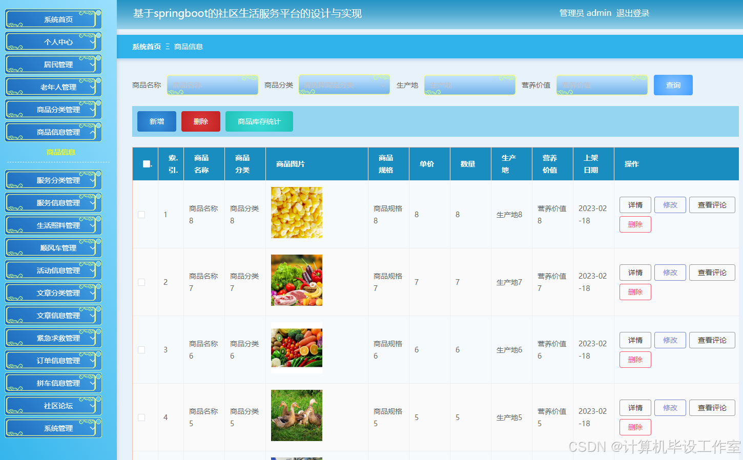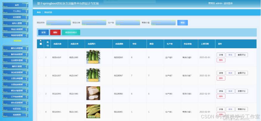 管理员点击商品信息管理;在商品信息管理页面对商品名称、商品分类、商品图片、商品规格、单价、数量、生产地、营养价值、上架日期等信息,进行查询,新增或删除商品信息等操作;如图5-10所示。