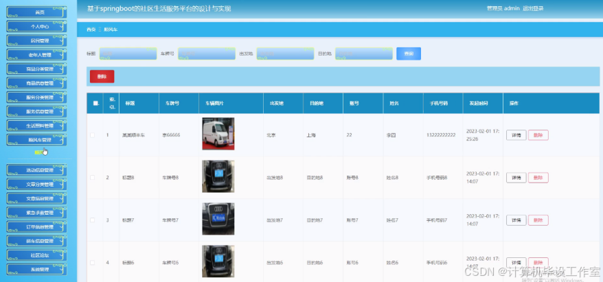 管理员点击顺风车管理;在顺风车管理页面对标题、车牌号、车辆图片、出发地、目的地、账号、姓名、手机号码、发起时间等信息,进行查询或删除顺风车等操作;如图5-13所示。
