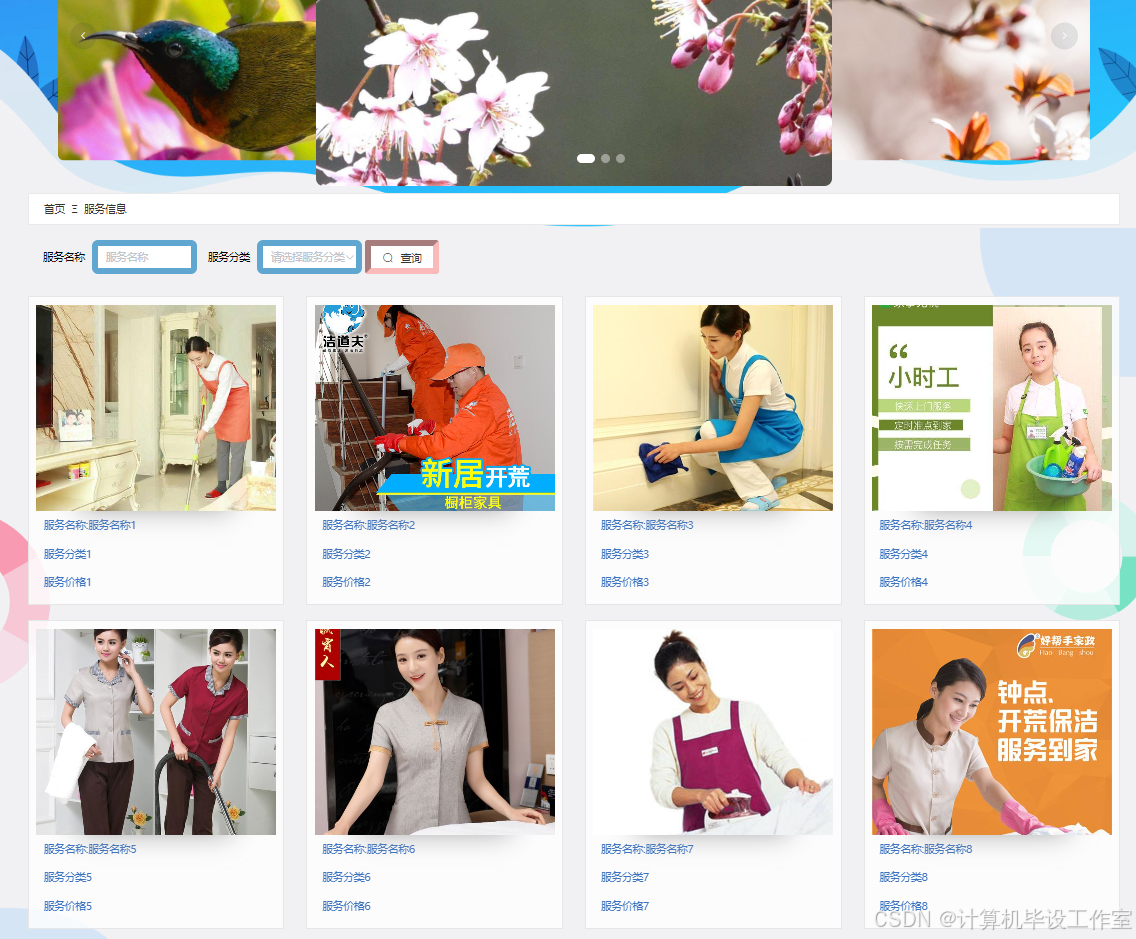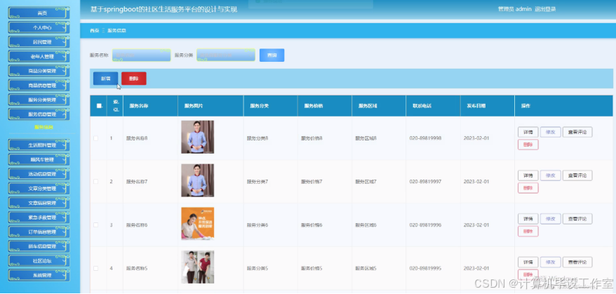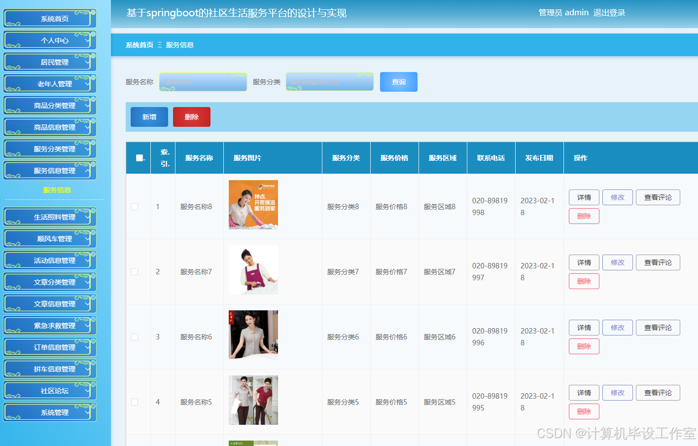 管理员点击服务信息管理;在服务信息管理页面对服务名称、服务图片、服务分类、服务价格、服务区域、联系电话、发布日期等信息,进行查询、新增或删除服务信息等操作;如图5-11所示。