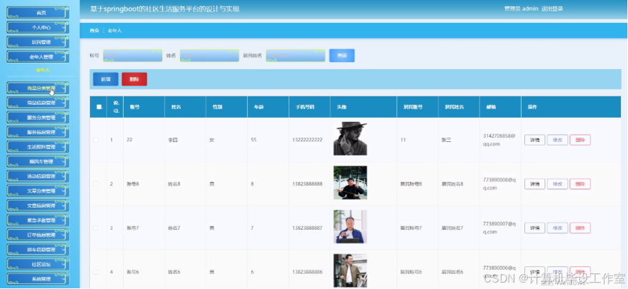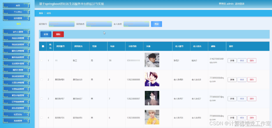 管理员点击居民管理;在居民管理页面对居民账号、居民姓名、性别、年龄、手机号码、头像、老人账号、老人姓名、邮箱等信息,进行查询,新增或删除居民信息等操作;如图5-8所示。