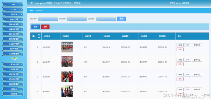 管理员点击活动信息管理;在活动信息管理页面对活动名称、活动图片、活动类型、活动地址、活动日期、注意事项、发布日期等信息,进行查询或新增、删除活动信息等操作;如图5-14所示。