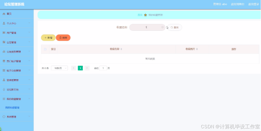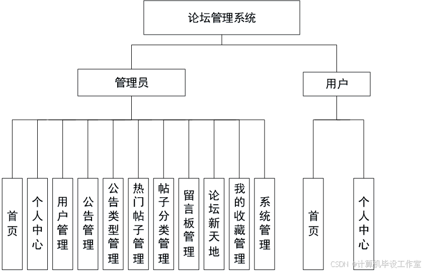 管理员:首页、个人中心、用户管理、公告管理、公告类型管理、热门帖子管理、帖子分类管理、留言板管理、论坛新天地、我的收藏管理、系统管理
