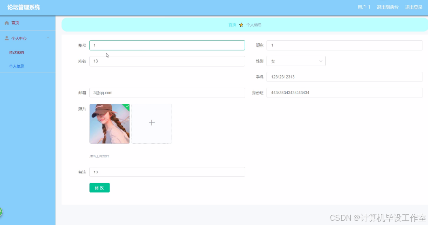 个人信息,在个人信息页面中通过填写账号、昵称、姓名、性别、手机、邮箱、身份证、照片、备注等信息进行修改,如图4-16所示。