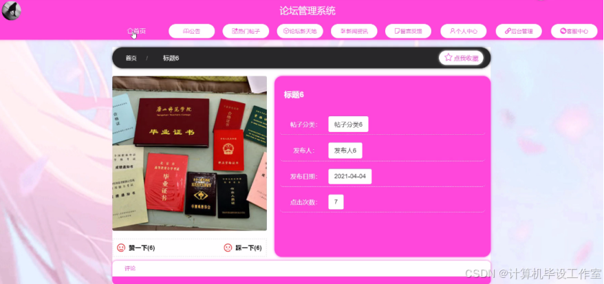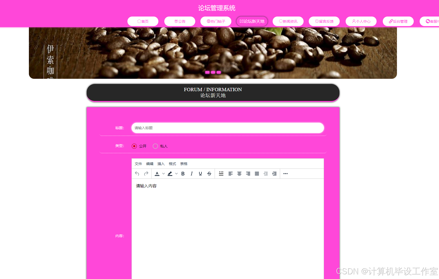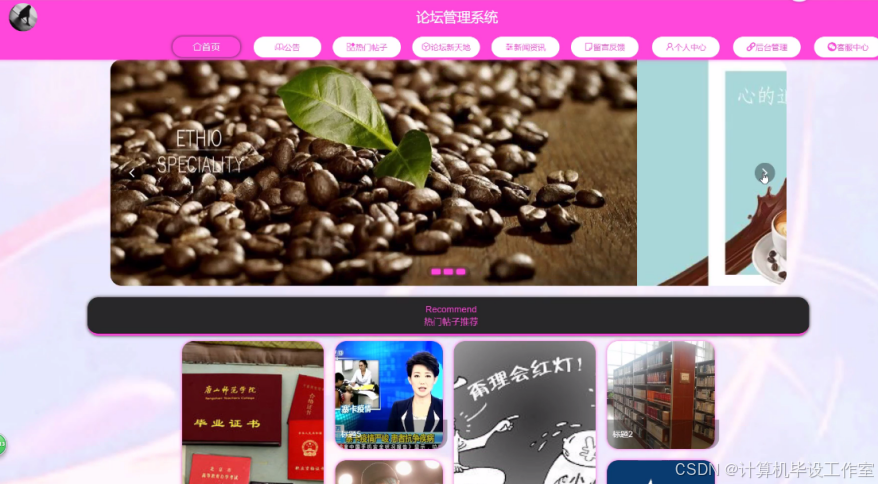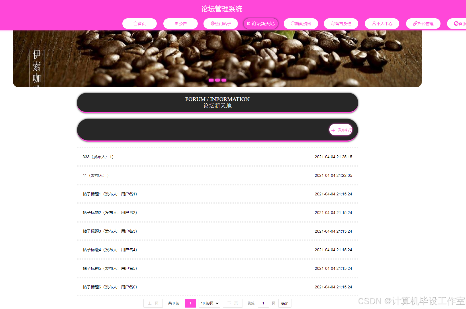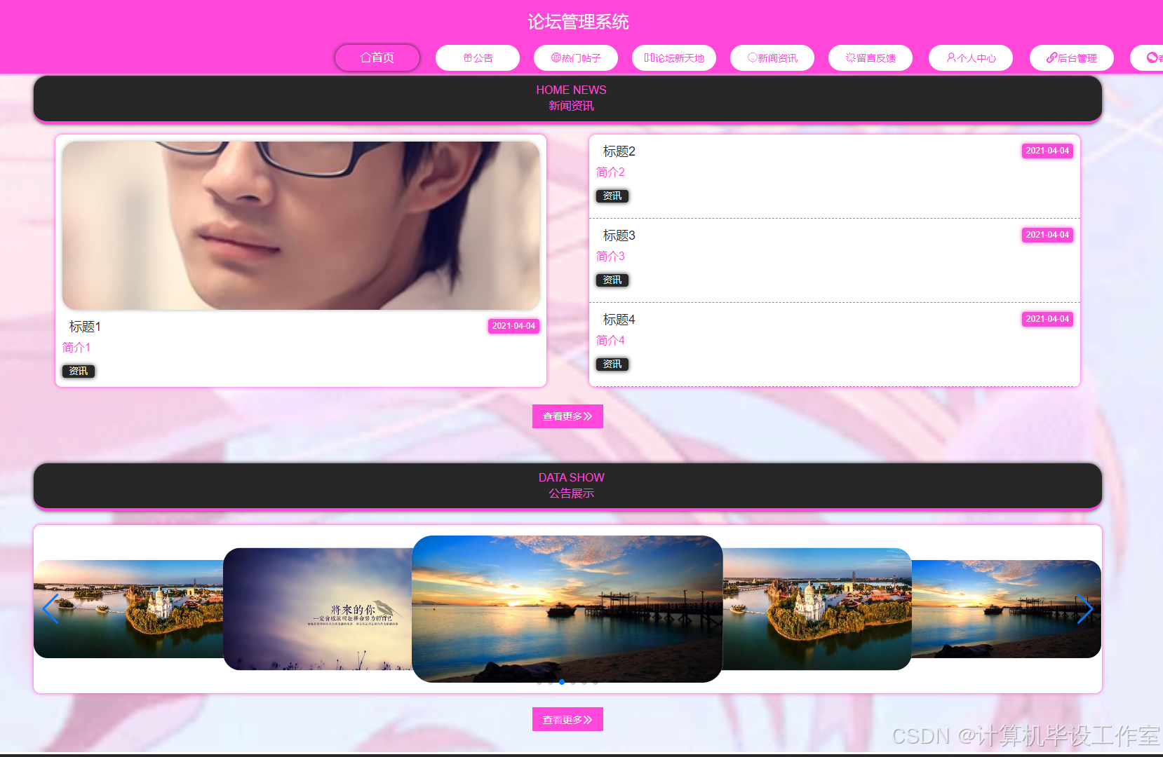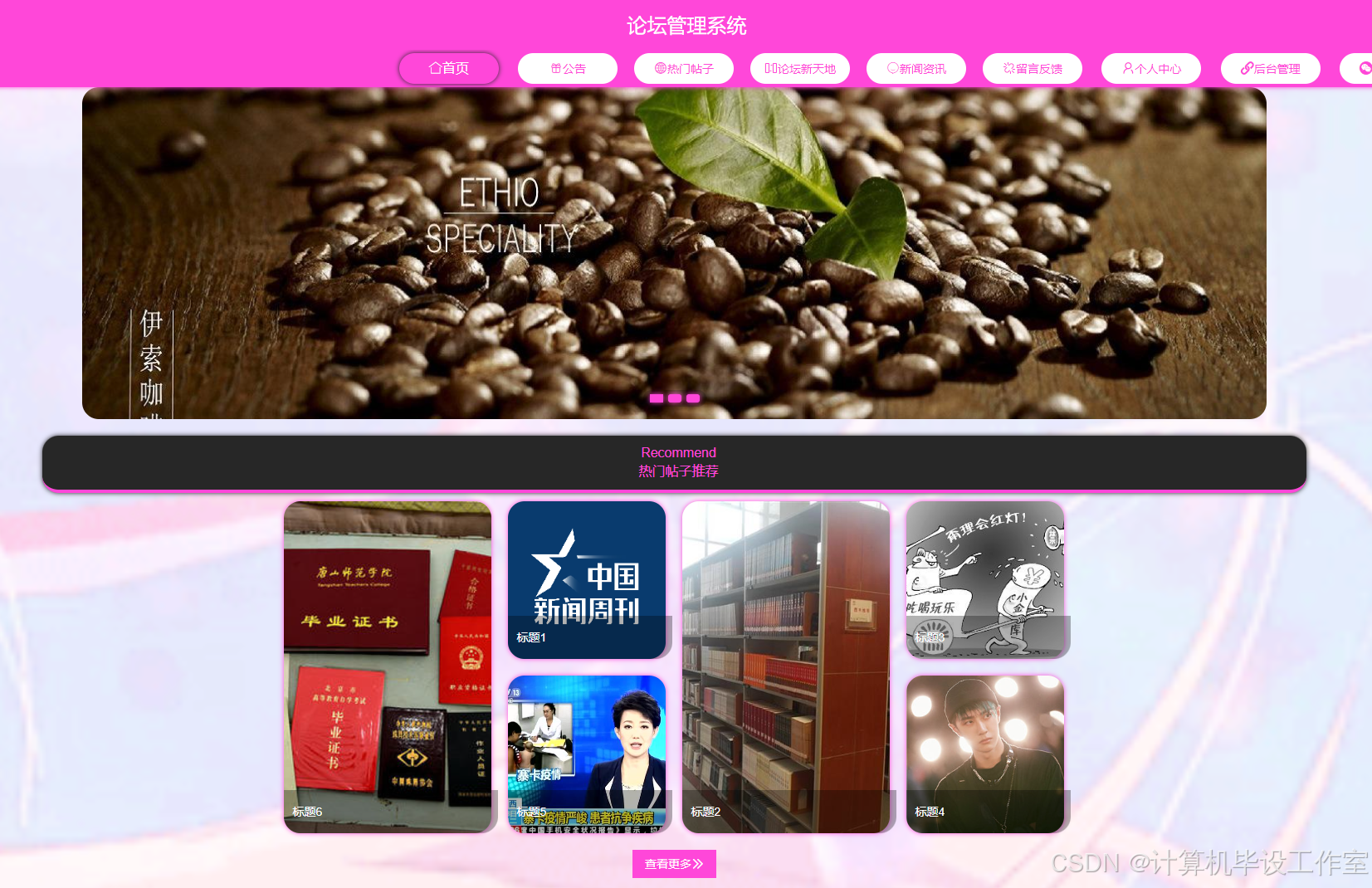 前台首页:首页、公告、热门帖子、论坛新天地、新闻资讯、留言反馈、个人中心、后台管理、客服中心,个人中心等功能