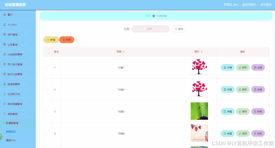 新闻资讯,在新闻资讯页面中可以查看标题、图片等内容,并且根据需要对已有新闻资讯进行详情,修改或删除等详细操作,如图4-15所示。