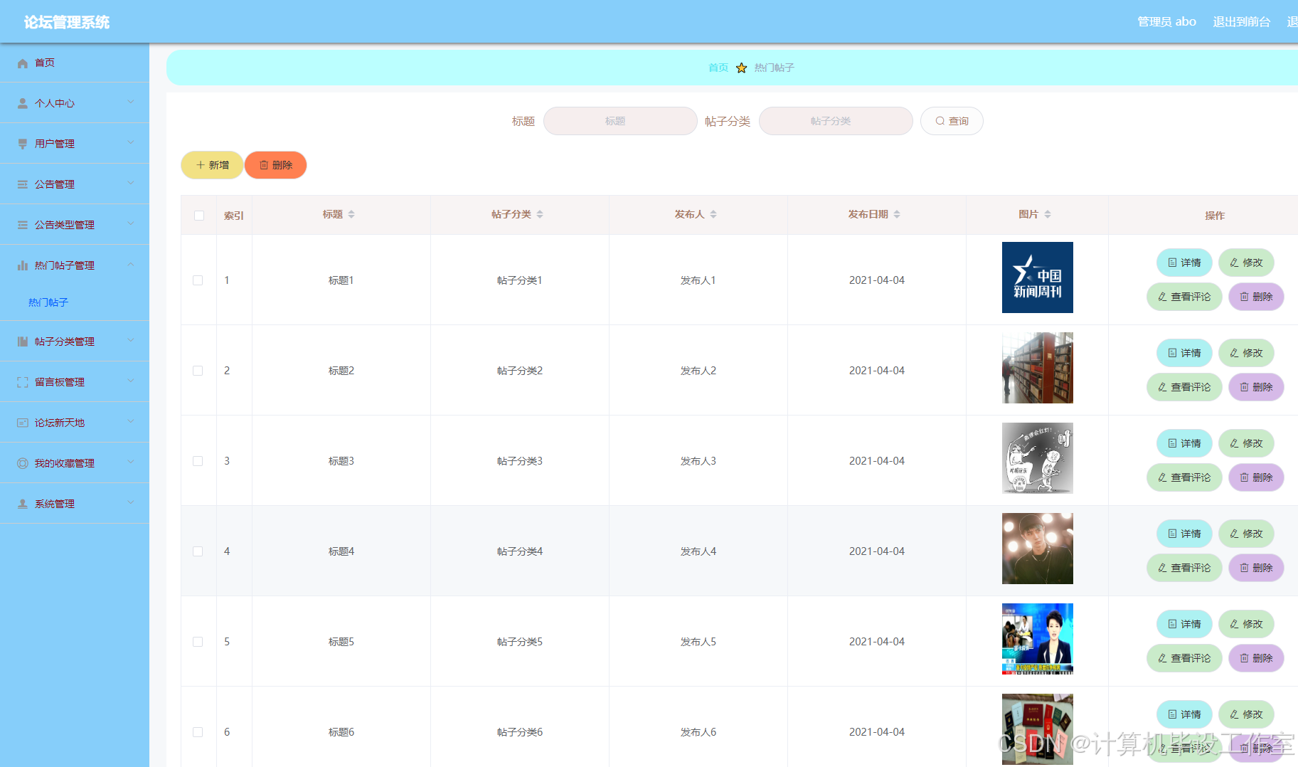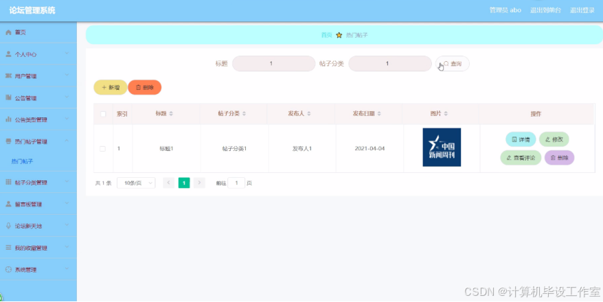 热门帖子管理,在热门帖子管理页面中可以查看标题、帖子分类、发布人、发布日期、图片等信息,并可根据需要对已有热门帖子管理进行修改或删除等详细操作,如图4-9所示。