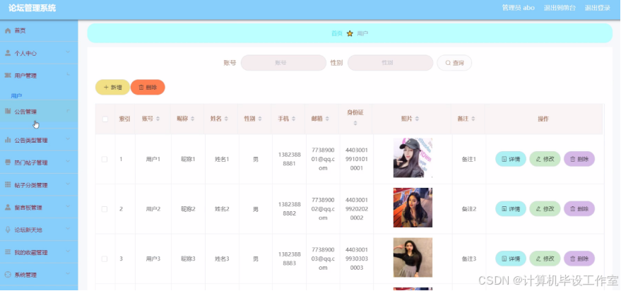 用户管理,在用户管理页面中可以通过查看账号、昵称、姓名、性别、手机、邮箱、身份证、照片、备注等内容进行修改,如图4-6所示。还可以根据需要对公告管理进行详情,修改或删除等详细操作,如图4-7所示。