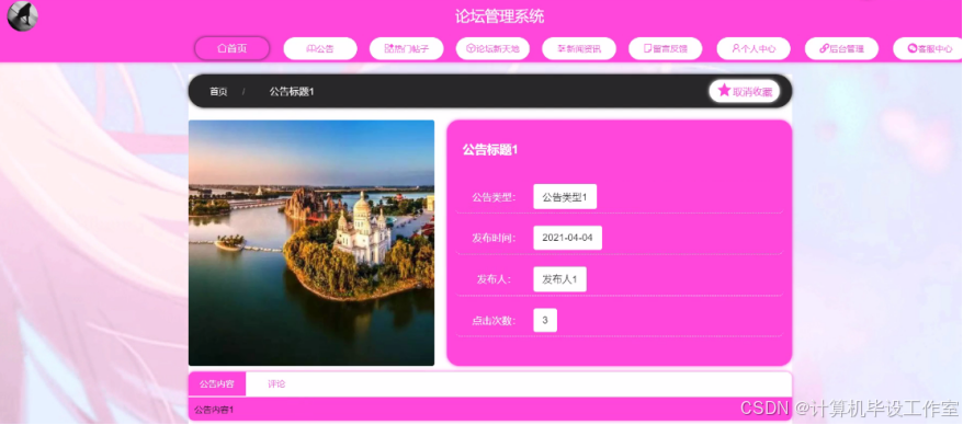 热门帖子,在热门帖子页面通过查看标题、帖子分类、发布人、发布日期、点击次数等信息进行点我收藏,如图4-3所示。在公告页面通过查看公告标题、公告类型、发布时间、发布人、点击次数等信息进行提交操作,如图4-4所示。
