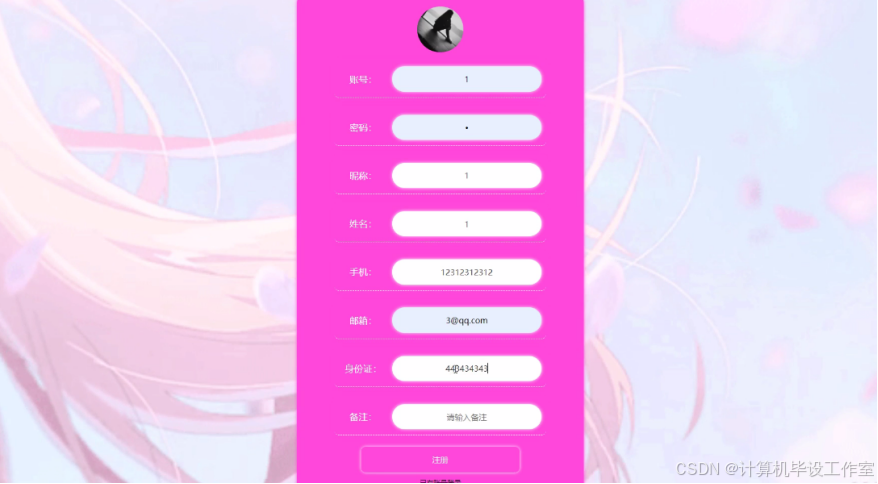 用户登录、用户注册,在注册页面可以填写账号、密码、昵称、姓名、手机、邮箱、身份证、照片、备注等详细内容进行注册、登录,如图4-2所示。