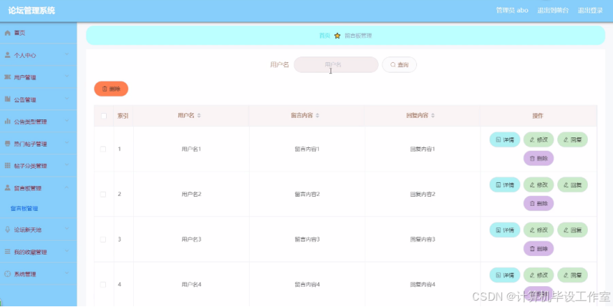 留言板管理,在留言板管理页面中可以查看用户名、留言内容、回复内容等内容,并且根据需要对已有留言板管理进行详情,修改或删除等详细操作,如图4-11所示。