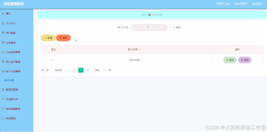 帖子分类管理,在帖子分类管理页面中可以查看帖子分类等内容,并且根据需要对已有帖子分类管理进行详情,修改或删除等详细操作,如图4-10所示。