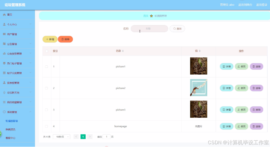 轮播图;该页面为轮播图管理界面。管理员可以在此页面进行首页轮播图的管理,通过新建操作可在轮播图中加入新的图片,还可以对以上传的图片进行修改操作,以及图片的删除操作,如图4-12所示。