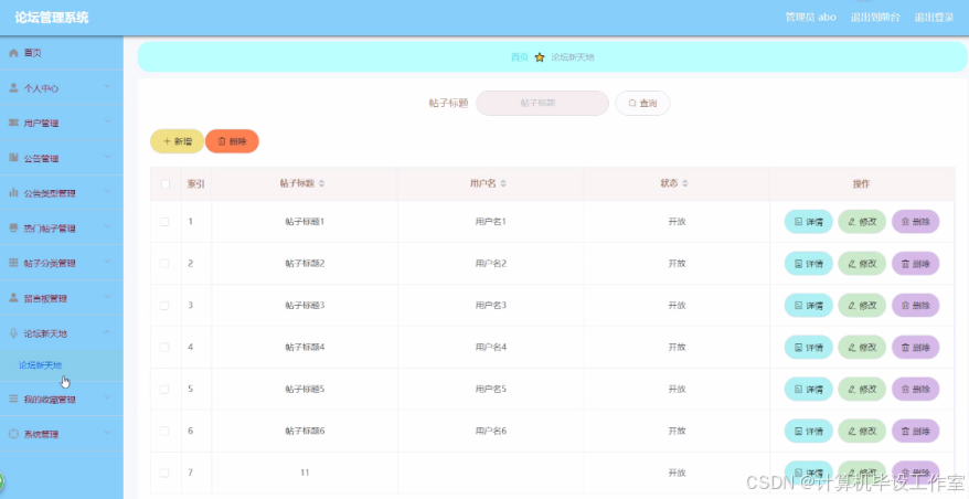论坛新天地,在论坛新天地页面中可以查看帖子标题、用户名、状态等内容,并且根据需要对已有论坛新天地进行详情,修改或删除等详细操作,如图4-13所示。