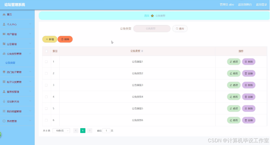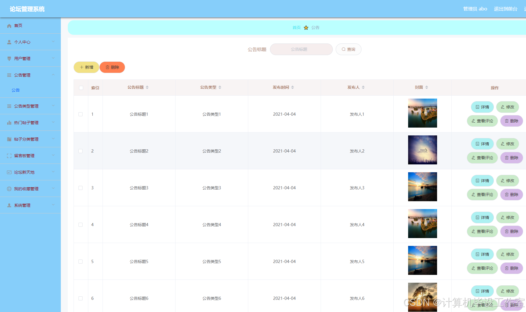 本论文系统地描绘了整个网上论坛管理系统的设计与实现,主要实现的功能有以下几点:管理员;首页、个人中心、用户管理、公告管理、公告类型管理、热门帖子管理、帖子分类管理、留言板管理、论坛新天地、我的收藏管理、系统管理,前台首页;首页、公告、热门帖子、论坛新天地、新闻资讯、留言反馈、个人中心、后台管理、客服中心,用户;首页、个人中心等功能,其具有简单的接口,方便的应用,强大的互动,完全基于互联网的特点。