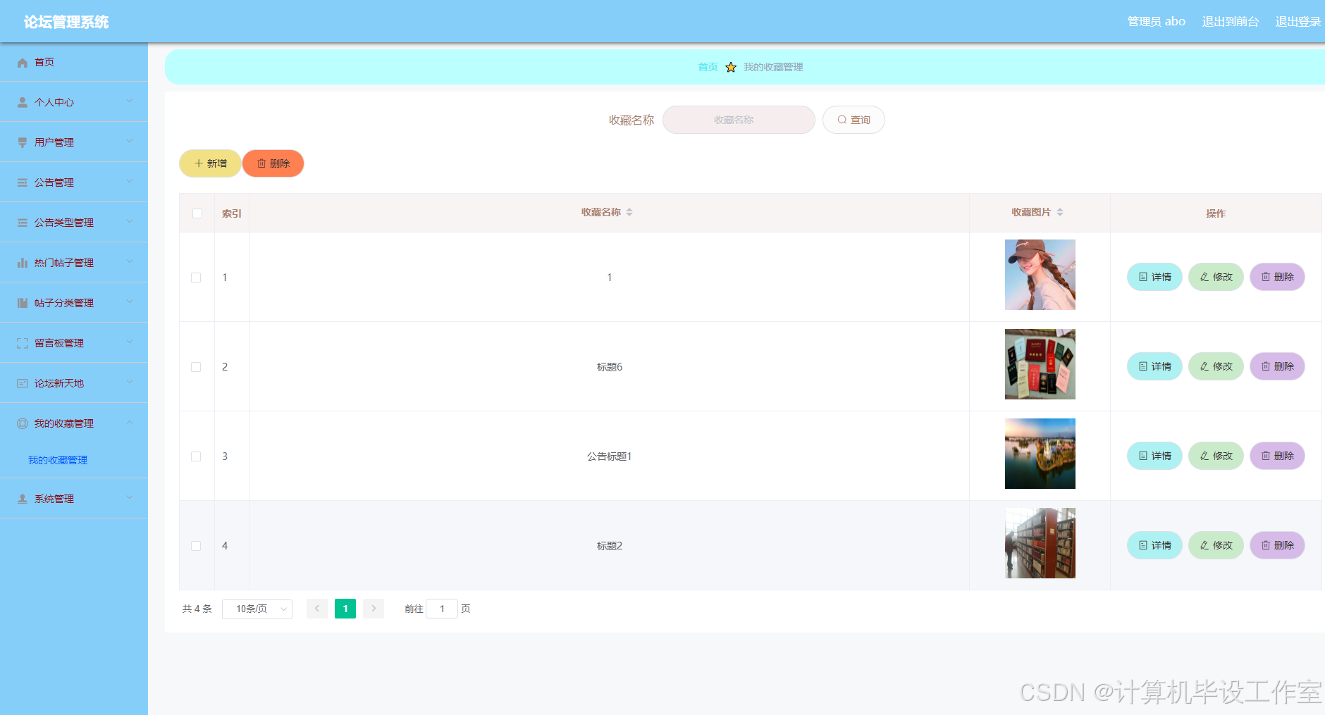 我的收藏管理,在我的收藏管理页面中可以查看收藏名称、收藏图片等内容,并且根据需要对已有我的收藏管理进行详情,修改或删除等详细操作,如图4-14所示。