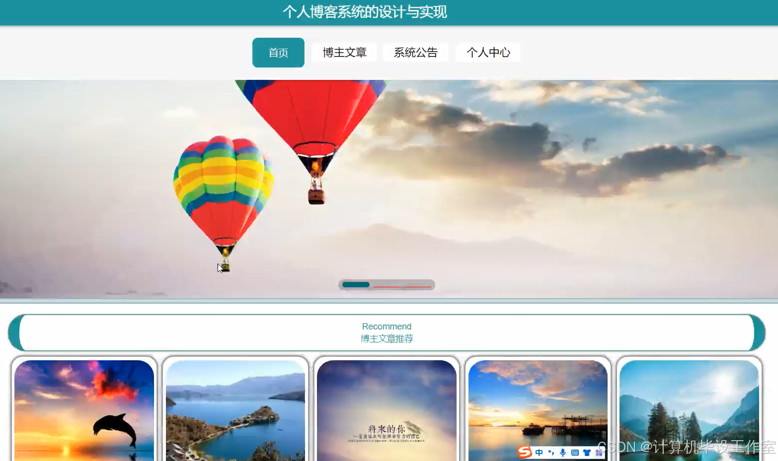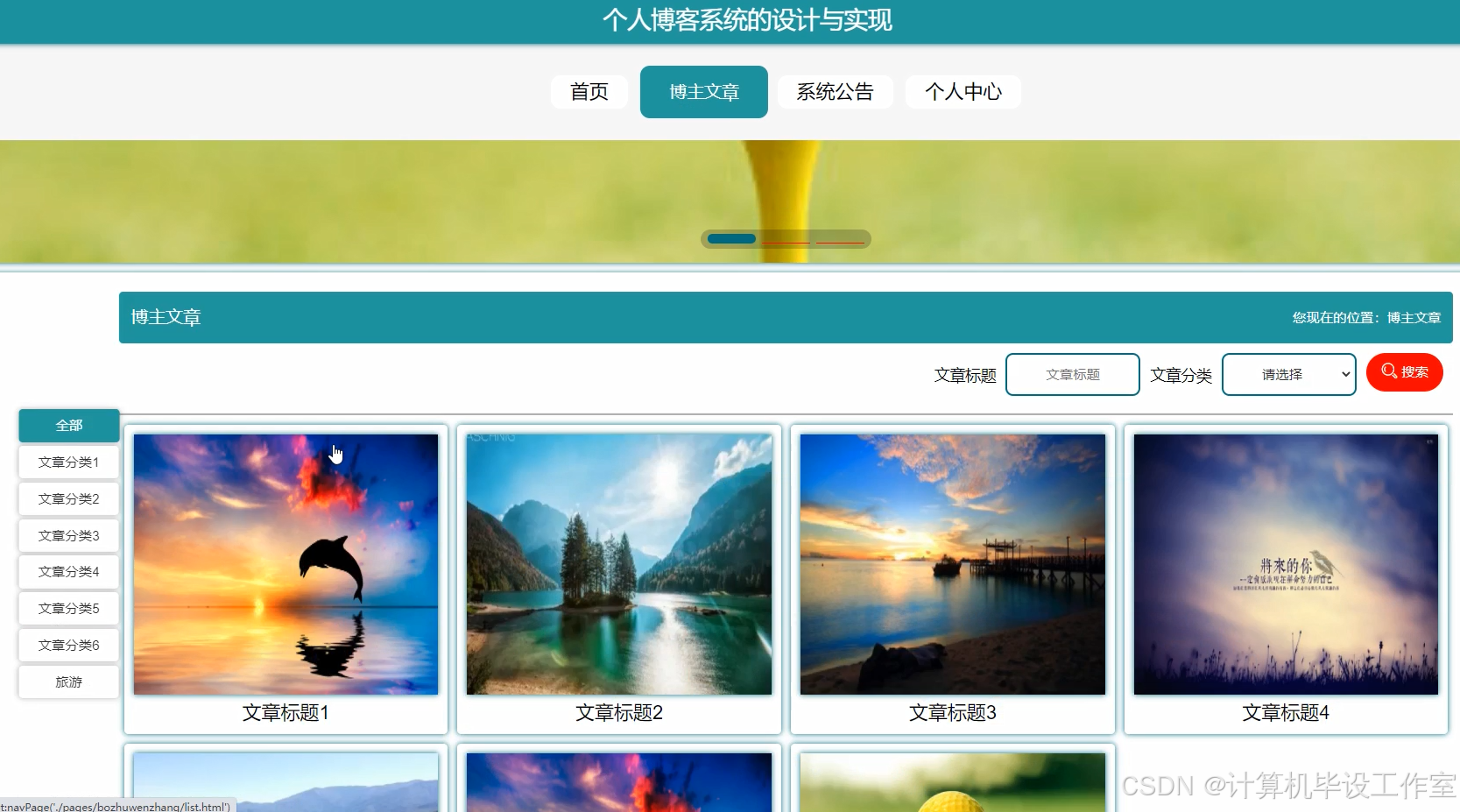 在这个推荐个性化的时代,采用新技术开发一个博客系统来分享和展示内容是一个永恒不变的需求。本次设计的个人博客系统有管理员,用户,博主三个角色。管理员功能有个人中心,用户管理,博主管理,文章分类管理,博主文章管理,系统公告管理,轮播图管理。博主可以注册登录,修改个人信息,对自己发布的博主文章进行管理操作。用户可以注册登录,查看管理员发布的公告信息和博主发布的文章信息,还可以对博主文章进行收藏评论以及评论操作。