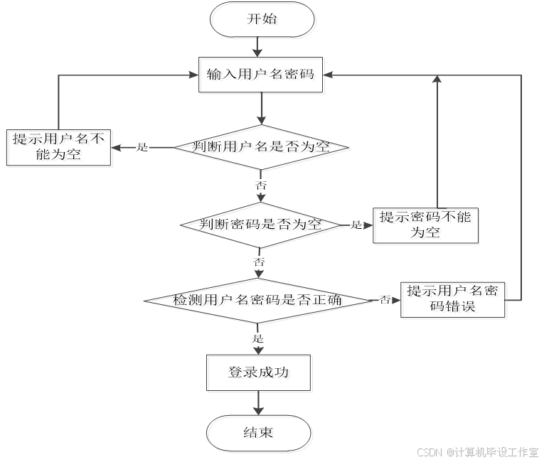 程序投入生活让使用者使用,都需要经过登录模块这个入门环节,这个功能也就像现实生活一样,需要使用正确的钥匙打开门,才能进入。而登录模块需要的钥匙就是账号,密码,这两项数据正确就能访问程序的功能区。登录流程也会在下图展示,里面也有相应的判断规则。