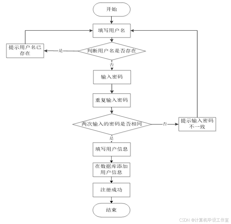 程序提供注册的功能(注册对应流程在下图展示)。就是让非系统操作用户变成程序的操作用户,主要让用户在注册页面上,根据页面提示,规范填写个人信息,程序也会根据用户填写的内容进行逻辑判断,确定用户身份是合格的身份之后,用户填写的数据才可以被数据库写入用户数据表里面。